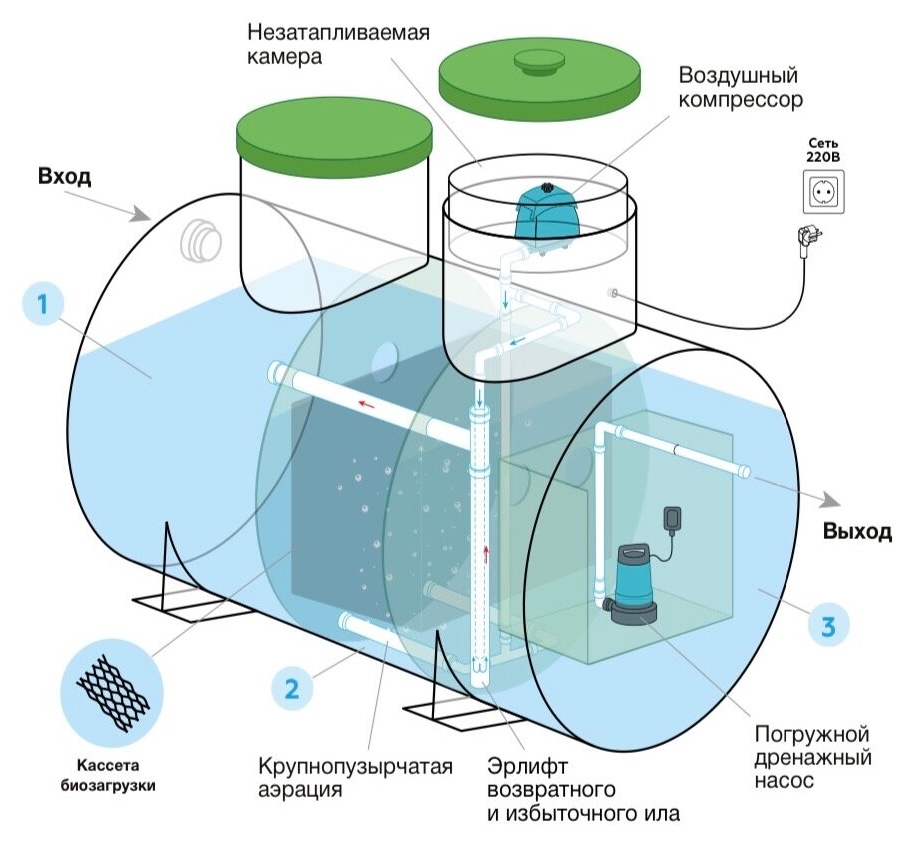 Строго говоря, аэробных септиков не существует, т.к. это именно станция биологической очистки, где происходит принудительная аэрация стоков, путем прокачки через них воздуха. Камера аэрации при этом колонизируется аэробными микроорганизмами, которые очищают стоки до уровня свыше 90%.